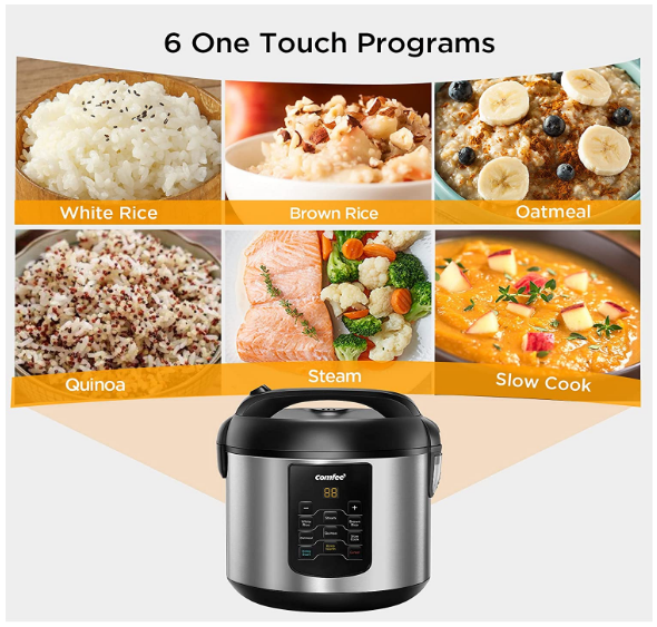 3- COMFEE’ Rice Cooker, 6-in-1 Stainless Steel Multi Cooker, Slow Cooker, Steamer, Saute, and Warmer, 2 QT, 8 Cups Cooked(4 Cups Uncooked), Brown Rice, Quinoa and Oatmeal, 6 One-Touch Programs